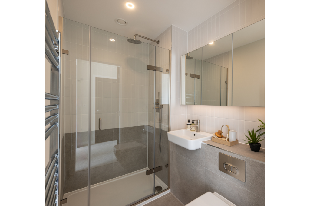 Finished to a high specification, features include underfloor heating, wide plank engineered wood flooring to the communal areas, large format ceramic tiling to the bathroom and carpet to bedrooms. The kitchen includes modern Bosch appliances and Silestone worktops. Bedroom 1 has built-in wardrobes and ta walk-in shower in the en-suite.