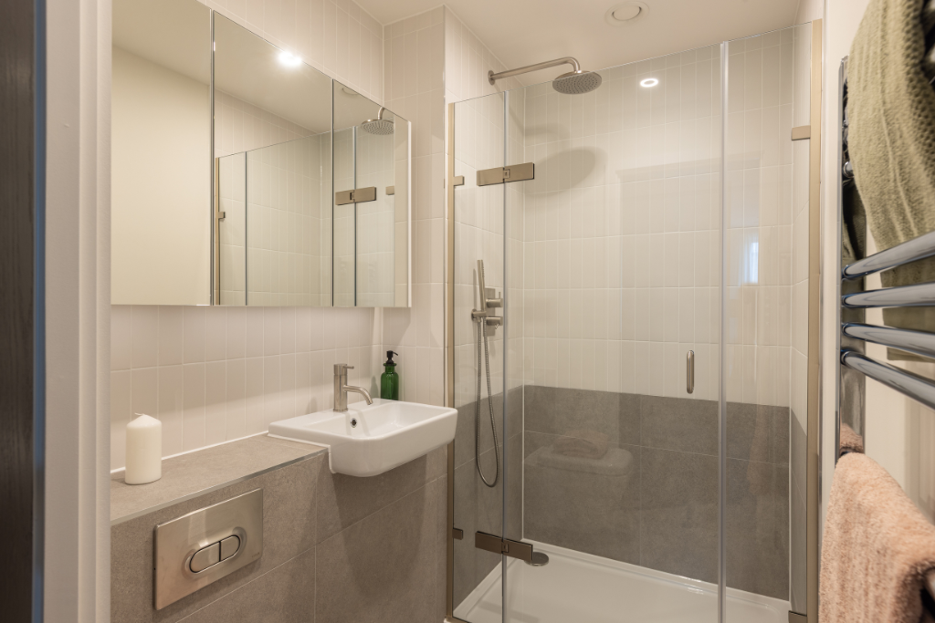 Finished to a high specification, features include underfloor heating, wide plank engineered wood flooring to the communal areas, large format ceramic tiling to the bathroom and carpet to bedrooms. The kitchen includes modern Bosch appliances and Silestone worktops. Bedroom 1 has built-in wardrobes and an en-suite with a walk-in shower, and there is an additional bathroom in the hallway.