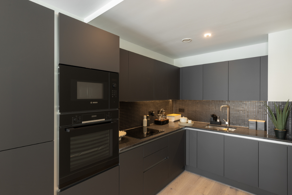 Modern kitchen with integrated Bosch appliances and Silestone worktops