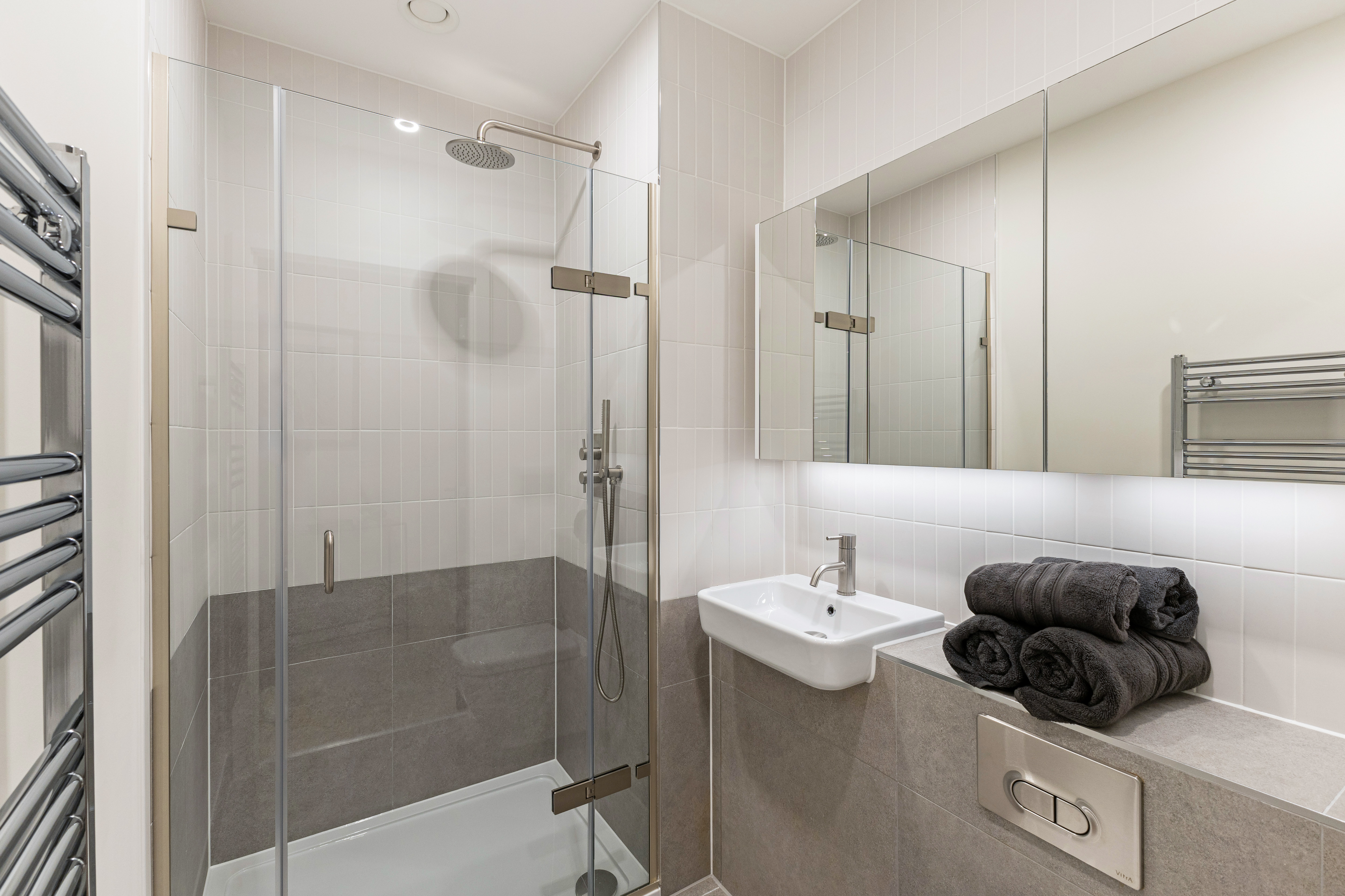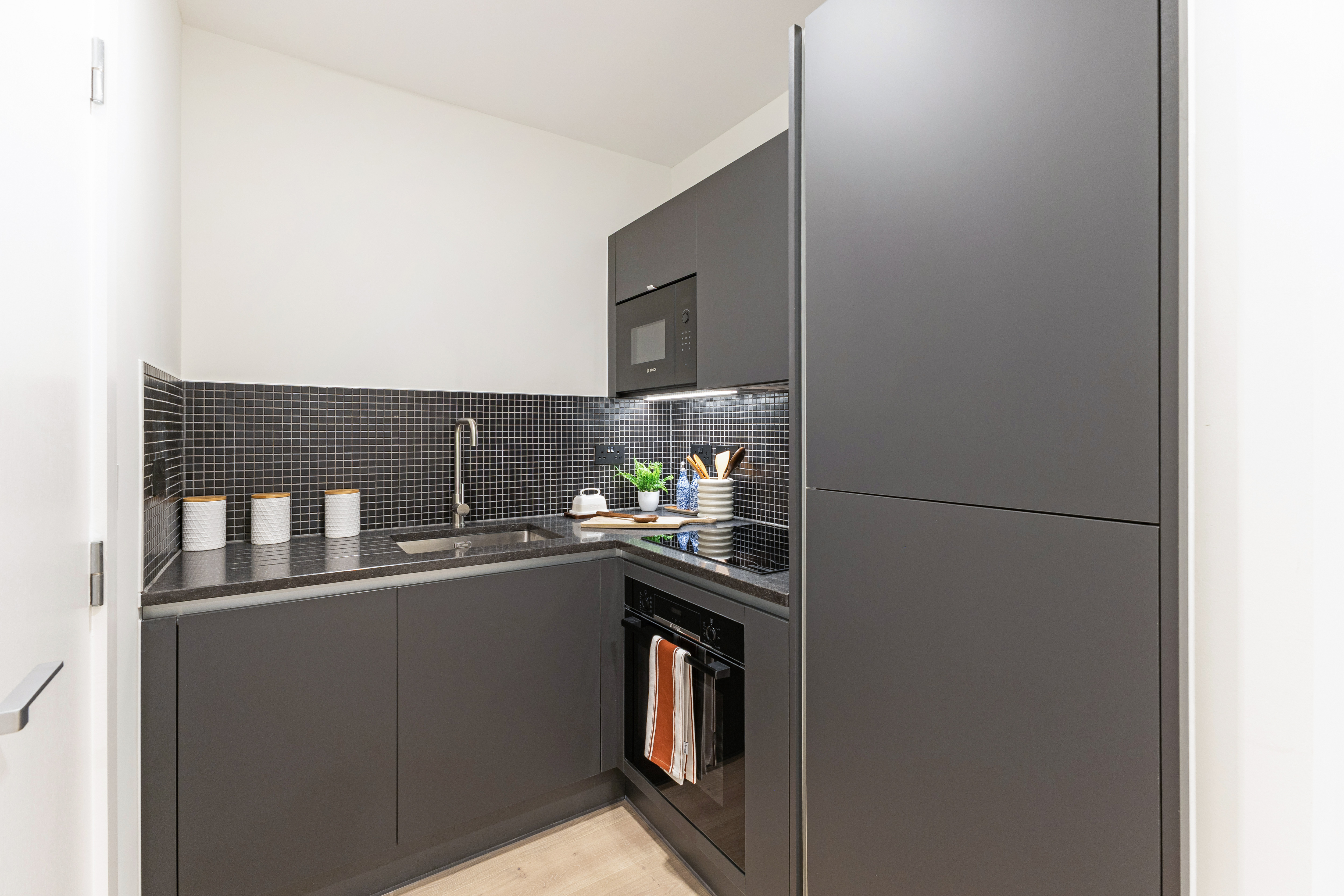 Finished to a high specification, features include underfloor heating, wide plank engineered wood flooring and large format ceramic tiling to the bathroom. The kitchen includes modern Bosch appliances and Silestone worktops. The sleeping area has a built-in wardrobe and additional store cupboard.