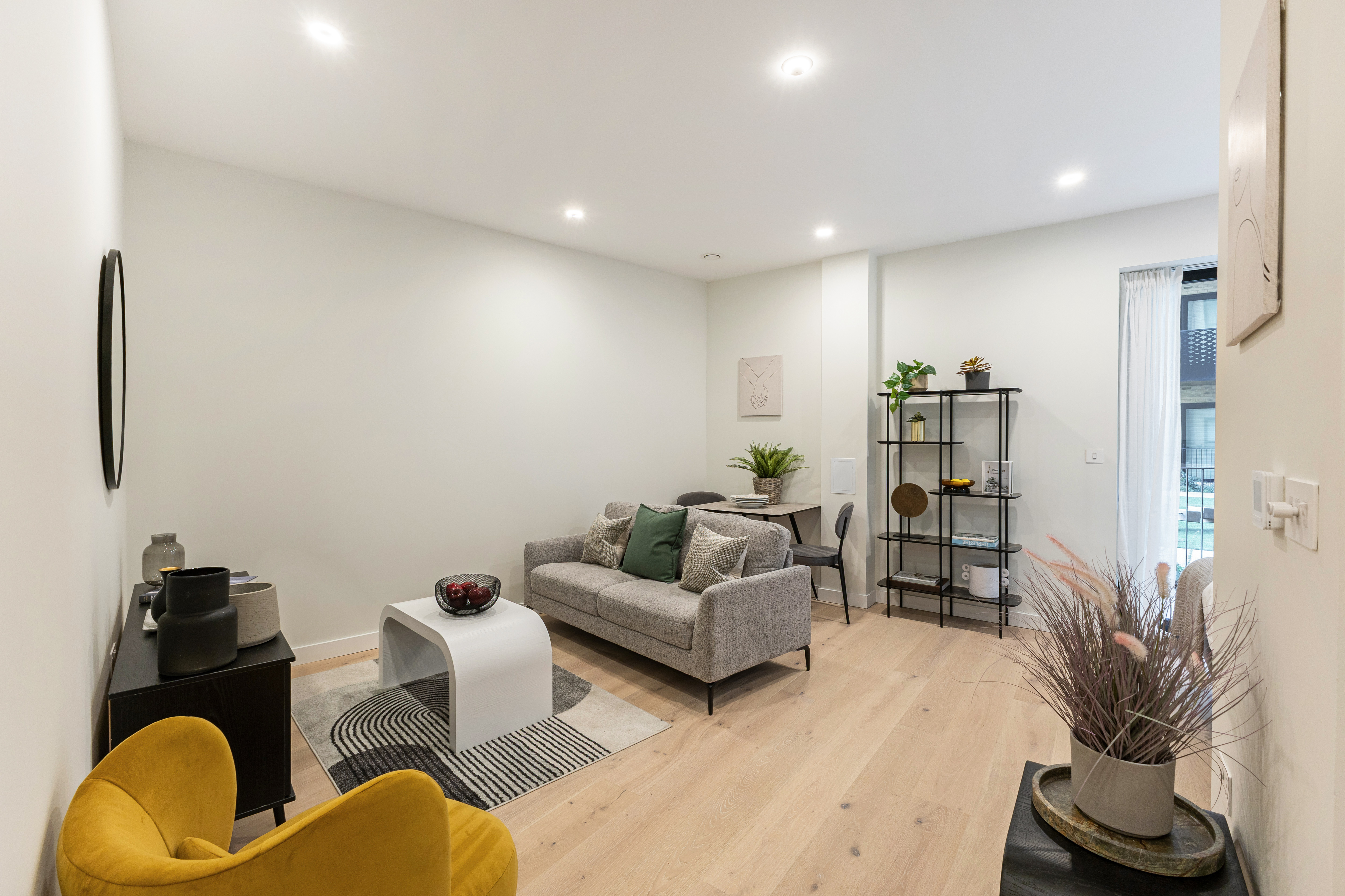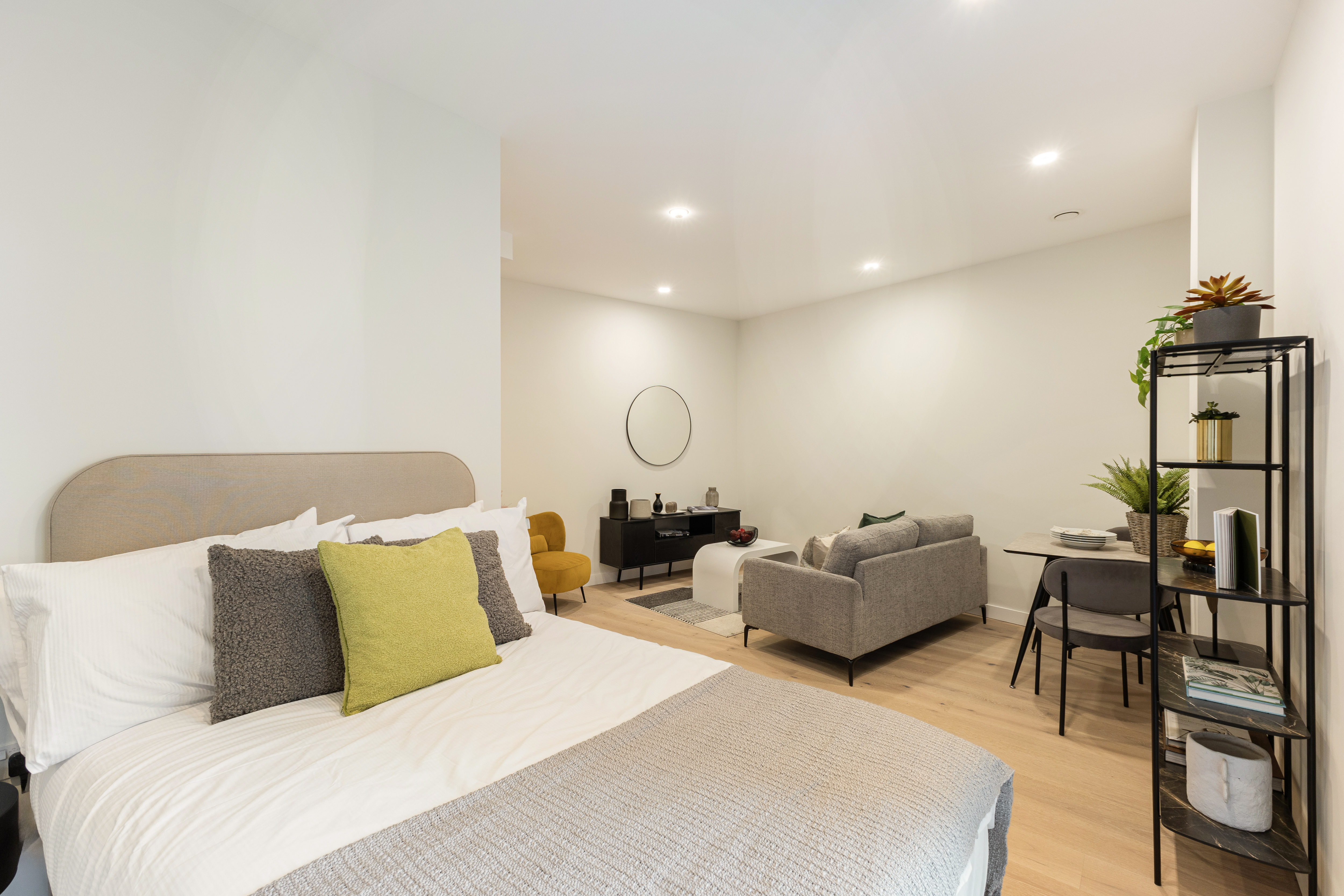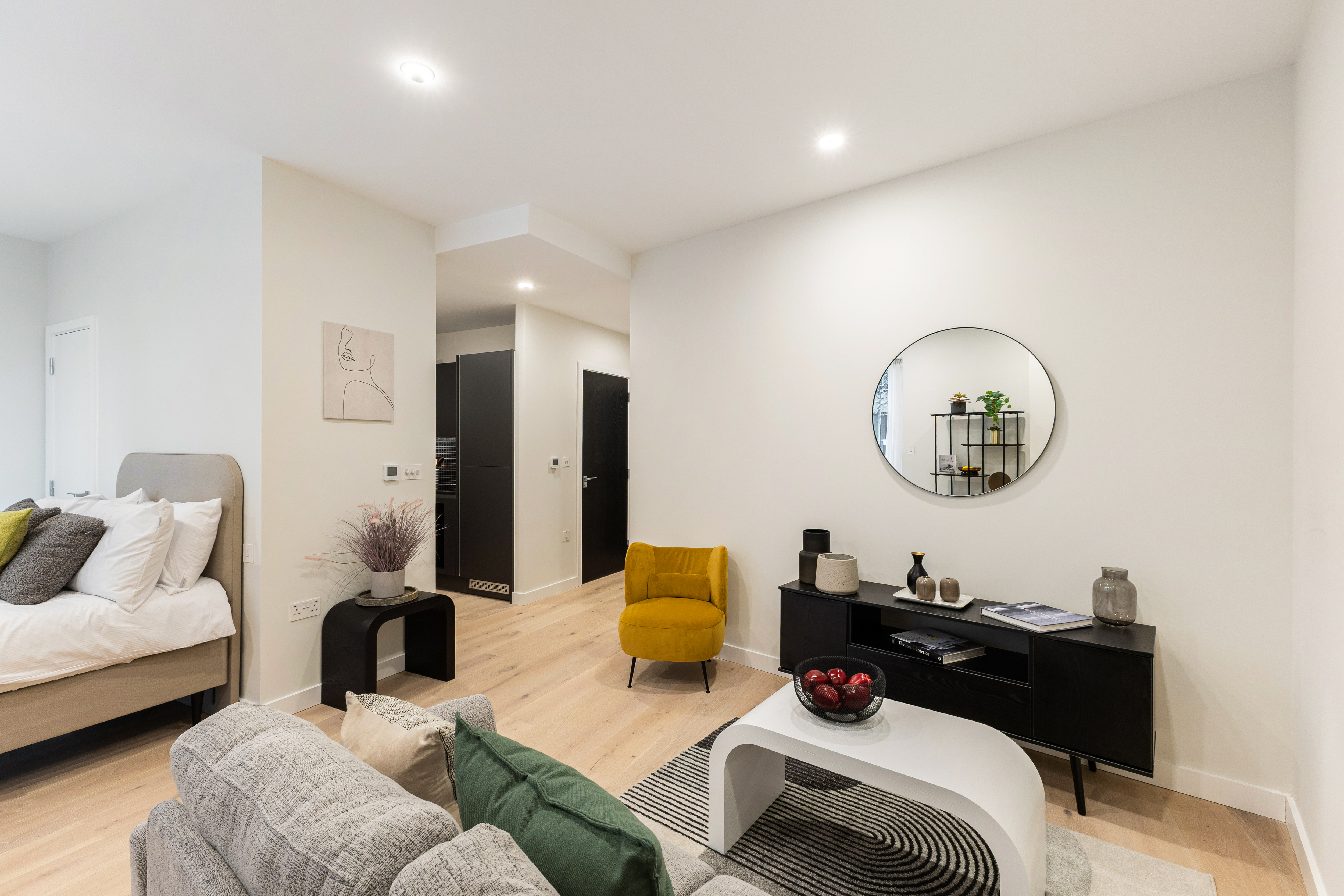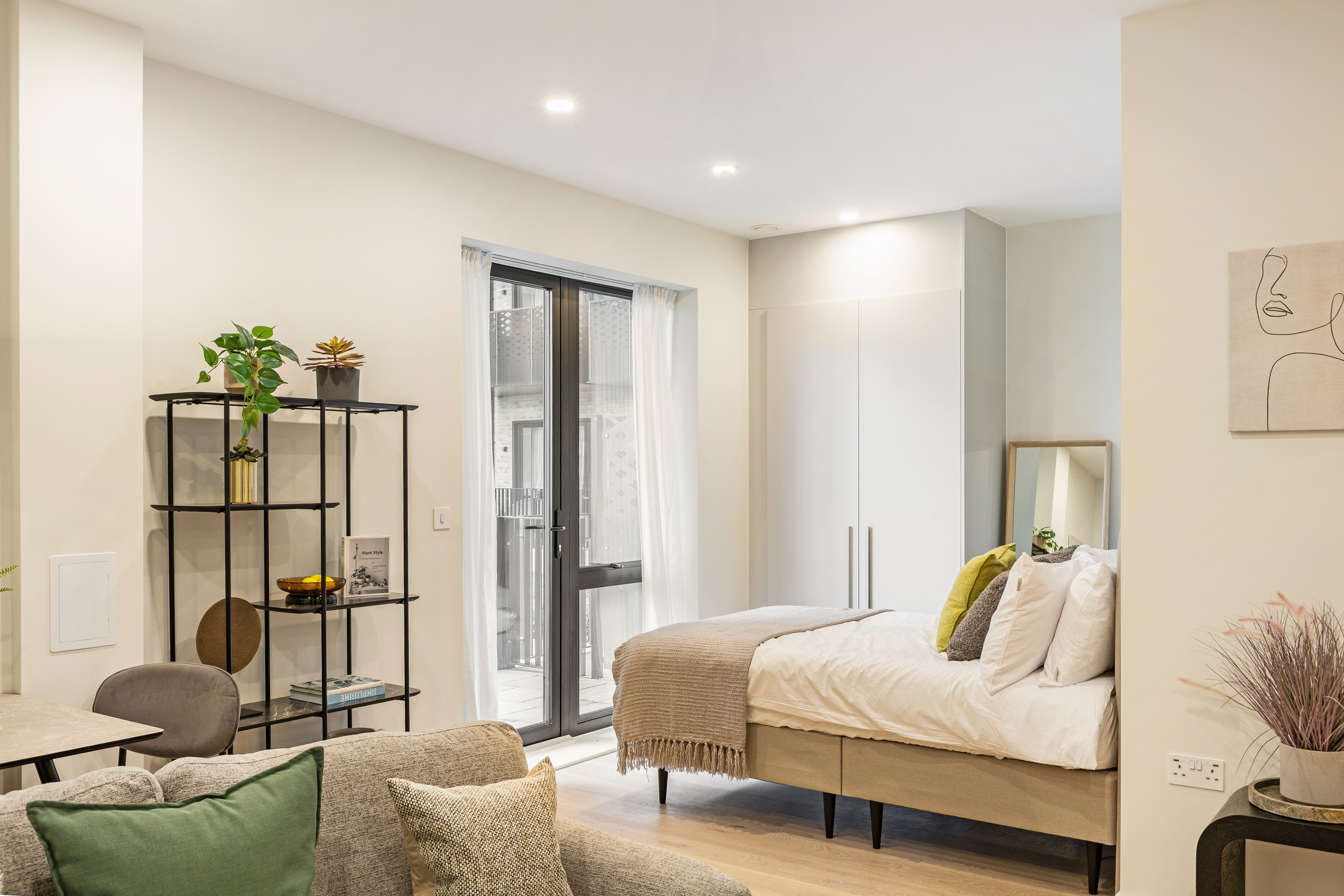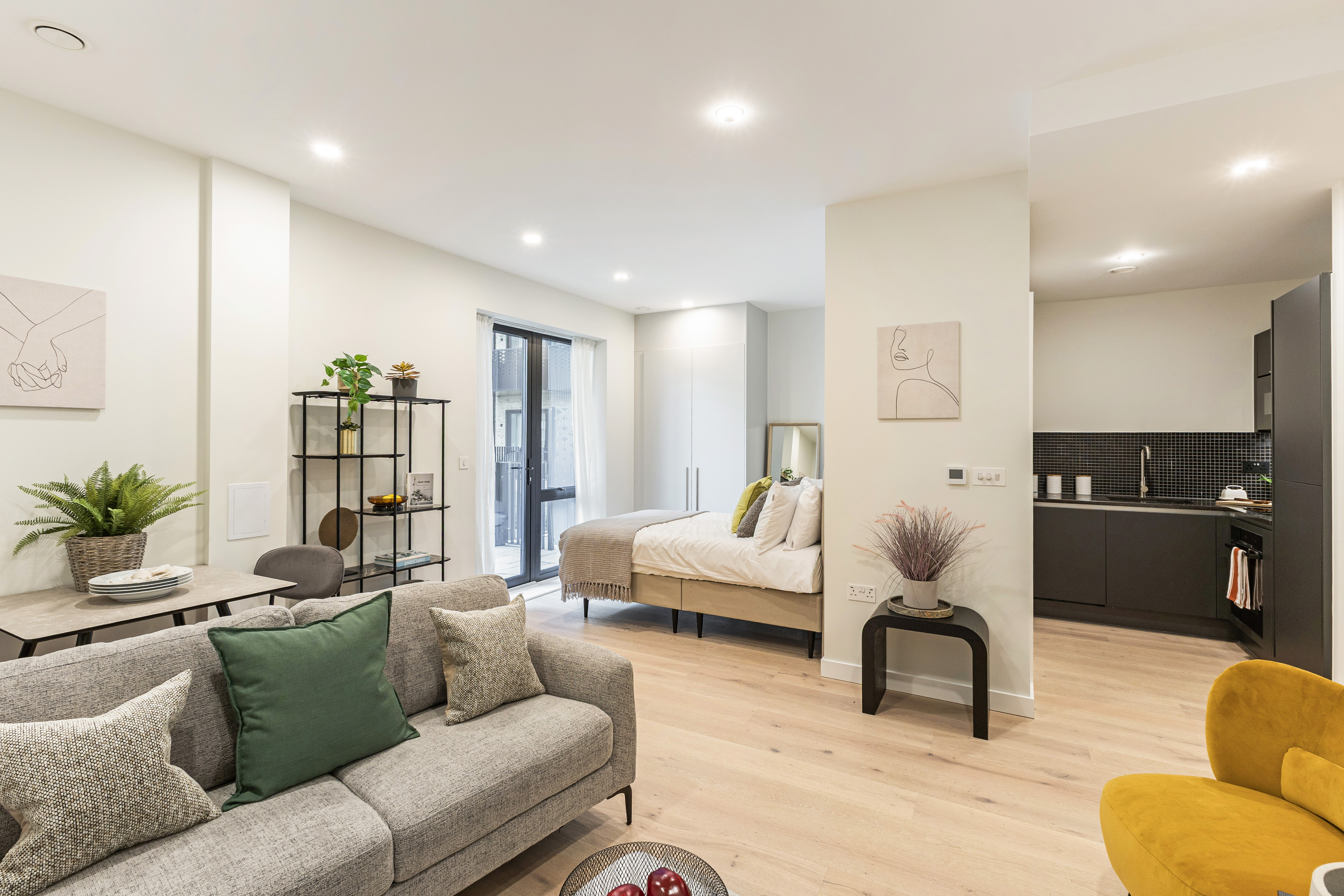 Move-in-ready brand-new 398 sq ft studio apartment designed with clever zones for cooking, relaxing and sleeping, as well as a large terrace looking out onto the communal garden.